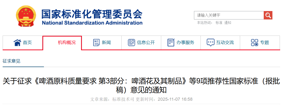 根据国家标准制修订计划,现就《啤酒原料质量要求 第3部分:啤酒花及其制品》等9项推荐性国家标准(报批稿)公开征求意见。请各有关单位或个人于2025年12月7日前将《意见反馈表》以寄回、传真或电子邮件形式反馈至国家标准化管理委员会,逾期视为无意见。